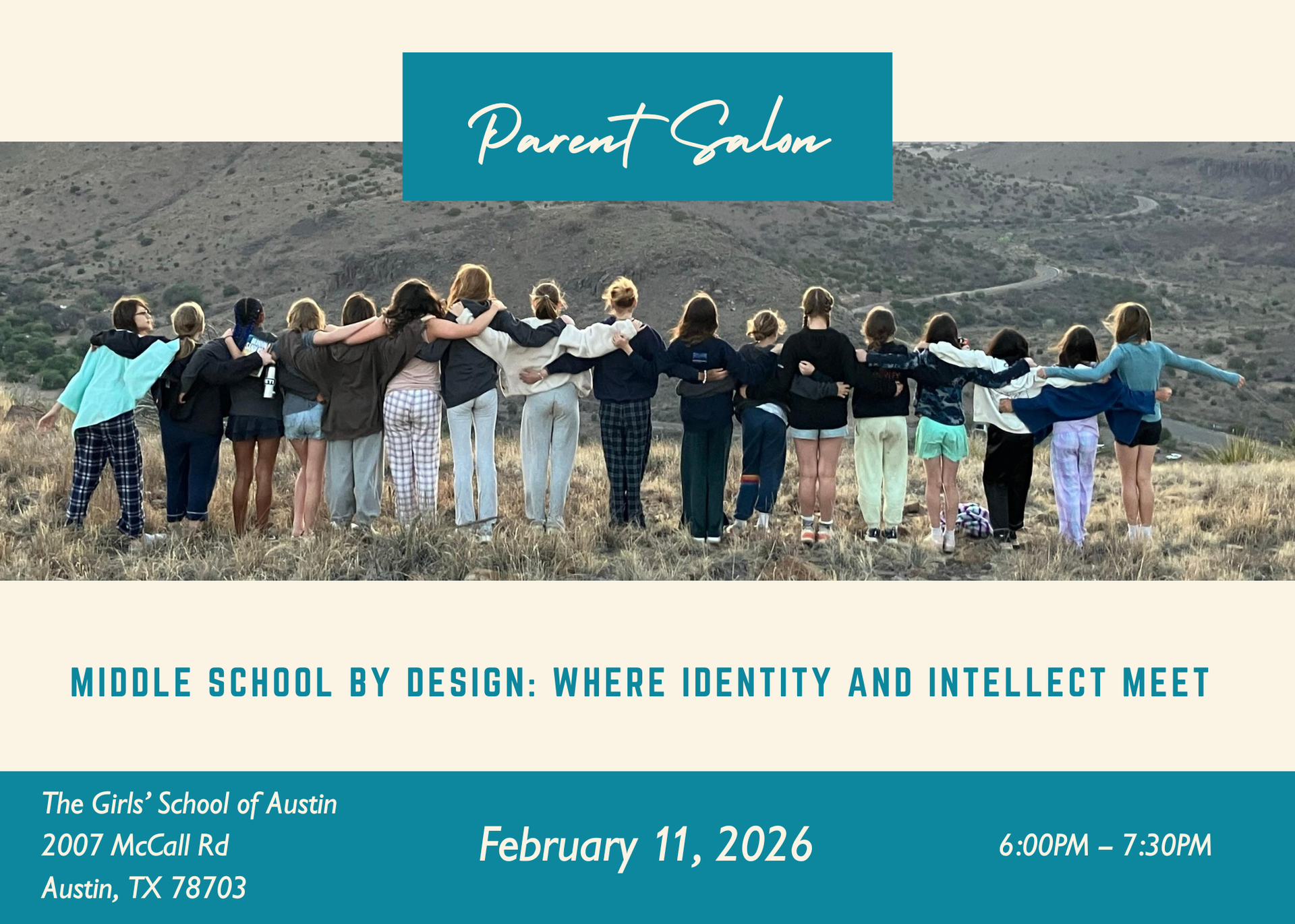 Join us on Wednesday, February 11, 2026 for our next Parent Salon—Middle School by Design: Where Identity and Intellect Meet–an evening of conversation and community focused on one of the most transformative stages in a girl’s education. While this topic highlights the middle school years, this Salon is open to families from all grade levels (K–8). Whether your daughter is already in middle school or you’re simply looking ahead, we hope you’ll join the conversation.